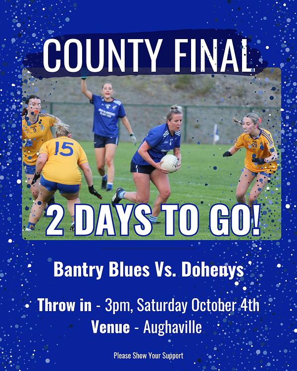 Have you got your flags, banners and bunting out to support Bantry Blues Ladies in their County Final this weekend? All roads lead to Aughaville on Saturday, where Bantry Blues face Dohenys in the Cork Credit Unions Junior A Championship decider at 3pm!